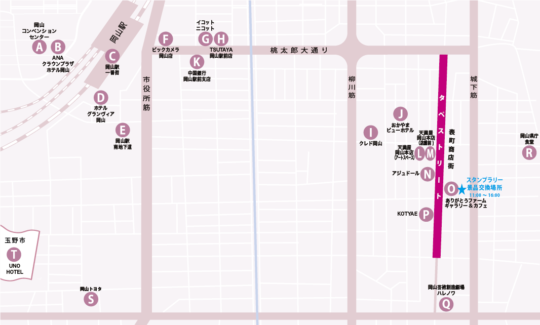 ―歩く。見る。感じる。集める。その一歩一歩が、人と想いをつなげていきます。― 共通コンセプト「しあわせの魔法」をテーマ描かれたハンディキャップアーティストの作品163点を、岡山の街なか各所に展示しています。 同時開催のデジタルスタンプラリーでアートと街歩きをお楽しみください。 共通コンセプト「しあわせの魔法」をテーマ描かれたハンディキャップアーティストの作品163点を、岡山の街なか各所に展示しています。 同時開催のデジタルスタンプラリーでアートと街歩きをお楽しみください。 街なかアートギャラリー 展示場一覧 展示作品一覧 岡山市内を中心に開催される「蜂谷工業presentsおかやまインクルーシブフェスティバル2026しあわせの魔法」では、JTBとコラボしたデジタルスタンプラリーを実施します。 MAP-A 岡山コンベンションセンター 期間:2026/2/1~2026/2/15定休日:なし営業時間:9:00~18:00住所:岡山市北区駅元町14−1 作品一覧 MAP-B ANAクラウンプラザホテル 岡山ロビー 期間:2026/2/1~2026/2/15定休日:なし営業時間:24時間住所:岡山市北区駅元町15−1 作品一覧 MAP-C 岡山駅一番街 期間:2026/1/28~2026/2/15定休日:不定休営業時間:24時間(営業時間は10:00~20:00)住所:岡山市北区駅元町1-1 作品一覧 MAP-D ホテルグランヴィア岡山ロビー 期間:2026/2/1~2026/2/15定休日:なし営業時間:10:00~21:00住所:岡山市北区駅元町1−5 作品一覧 MAP-E 岡山駅南地下道 期間:2026/2/1~2026/2/15定休日:なし営業時間:24時間住所:岡山市北区駅元町1 作品一覧 MAP-F ビックカメラ 岡山店 4F 期間:2026/1/28~2026/2/15定休日:なし営業時間:10:00~20:30住所:岡山市北区駅前町1丁目1-1 作品一覧 MAP-G イコットニコット1F イベントスペース 期間:2026/2/1~2026/2/11定休日:なし営業時間:10:00~20:00住所:岡山市北区駅前町1丁目8ー18 作品一覧 MAP-H TSUTAYA 岡山駅前店 期間:2026/2/1~2026/2/15定休日:なし営業時間:10:00~22:00住所:岡山市北区駅前町1丁目8-18 2階 作品一覧 MAP-I クレド岡山 1F 期間:2026/2/1~2026/2/15定休日:なし営業時間:10:00~19:30住所:岡山市北区中山下1丁目8ー45 作品一覧 MAP-J おかやまビューホテルレストラン 『五感』 期間:2026/2/1~2026/2/15定休日:日曜、月曜営業時間:7:00~10:00、11:30~14:00住所:岡山市北区中山下1丁目11-17 作品一覧 MAP-K 中国銀行岡山駅前支店 2F 期間:2026/2/1~2026/2/15定休日:土日祝営業時間:10:00~15:00住所:岡山市北区本町2丁目5 作品一覧 MAP-L 天満屋岡山本店6F(アートスペース) 期間:2026/2/6~2026/2/15定休日:不定休営業時間:10:00~19:30(2/6から)住所:岡山市北区表町2丁目1ー1 作品一覧 MAP-M 天満屋岡山本店 (店舗前) 期間:2026/2/1~2026/2/15定休日:不定休営業時間:10:00~19:30住所:岡山市北区表町2丁目1ー1 作品一覧 MAP-N アジュドール 期間:2026/2/1~2026/2/15定休日:火曜日営業時間:10:00~19:00住所:岡山市北区表町2丁目1ー44 作品一覧 MAP-O ありがとうファームギャラリー&カフェ 期間:2026/2/1~2026/2/15定休日:2月2日営業時間:11:00~16:00住所:岡山市北区表町2丁目6-43 作品一覧 MAP-P KOTYAE 期間:2026/2/1~2026/2/15定休日:火営業時間:11:00~16:00住所:岡山市北区表町3丁目5-19 作品一覧 MAP-Q 岡山芸術創造劇場 ハレノワ3Fギャラリー 期間:2026/2/1~2026/2/15定休日:なし営業時間:10:00~18:00住所:岡山市北区表町3丁目11番50号 作品一覧 MAP-R 岡山県庁食堂 期間:2026/2/1~2026/2/15定休日:土日祝営業時間:11:00~17:00住所:岡山市北区内山下2丁目4-6 地下1階 作品一覧 MAP-S 岡山トヨタ 本店 期間:2026/2/1~2026/2/15定休日:毎月第3日曜日営業時間:9:00~18:00住所:岡山市北区大供3丁目2−12 作品一覧 MAP-T UNO HOTEL 期間:2026/2/1~2026/2/15定休日:なし営業時間:24時間住所:岡山県玉野市築港1丁目-1-12 作品一覧 ●スタンプラリーの参加方法展示会場 21ヶ所 のうち、14ヶ所に専用QRコードを設置各会場でQRコードを読み取ると デジタルスタンプを1つゲット!14ヶ所中、6ヶ所分のスタンプを集めるとチャレンジ達成!●達成特典(ハズレなし!)スタンプを6個集めた方は、岡山市表町商店街内の「ありがとうファームギャラリー&カフェ」で《外れなしのクジ》に参加できます。 関連企画として、特別支援学校11校・のべ537名の生徒が「しあわせの魔法」をテーマに大型タペストリー作品制作を行いました。 フェスティバル期間中の2026年2月1日~15日、表町商店街アーケードが「しあわせの魔法」タペストリートに変わります! タペストリー制作参加校(五十音順) 岡山県立岡山支援学校岡山県立倉敷まきび支援学校 岡山県健康の森学園支援学校岡山県立東備支援学校岡山県立岡山西支援学校岡山県立早島支援学校 岡山県立岡山東支援学校岡山県立岡山南支援学校岡山県立岡山聾学校岡山大学附属特別支援学校倉敷市立倉敷支援学校 ハレノワ2Fロビー/千日前ハレノワ通り 特別公演 2026.2.11 演じるとは何か? ⽣きるとは何か? ⼈⽣とは何か?現代社会を映し出す、あらたな演劇プログラムの幕が上がる。 詳細はこちら >> おかやまインクルーシブアワード2026表彰式 2026.2.11 パフォーマンスの公開審査と各部門の入賞式が盛大に!魔法の森のアワードパーティー! 詳細はこちら >> にぎやかな屋台が ハレノワのまわりに! 2026.2.11 世界中の