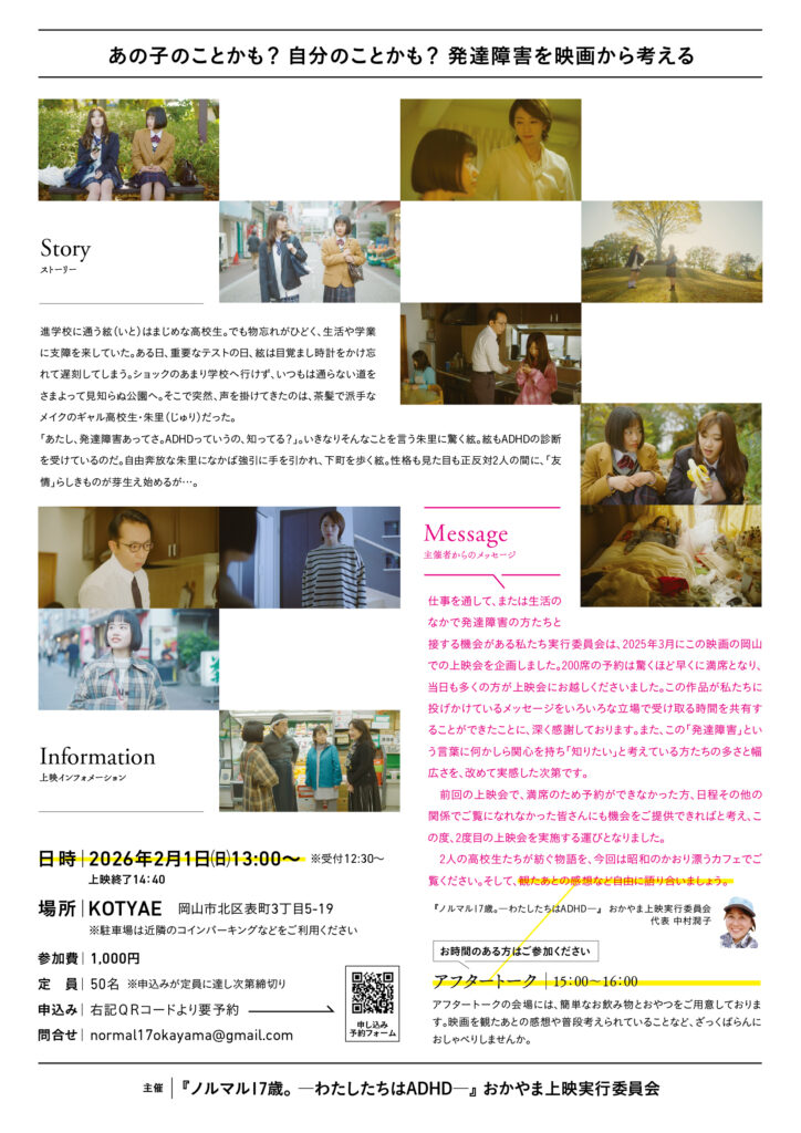 このたび、おかやまインクルーシブフェス期間中に、「ノルマル17歳。-わたしたちはADHD-」の上映会&アフタートークの開催が決定しました!